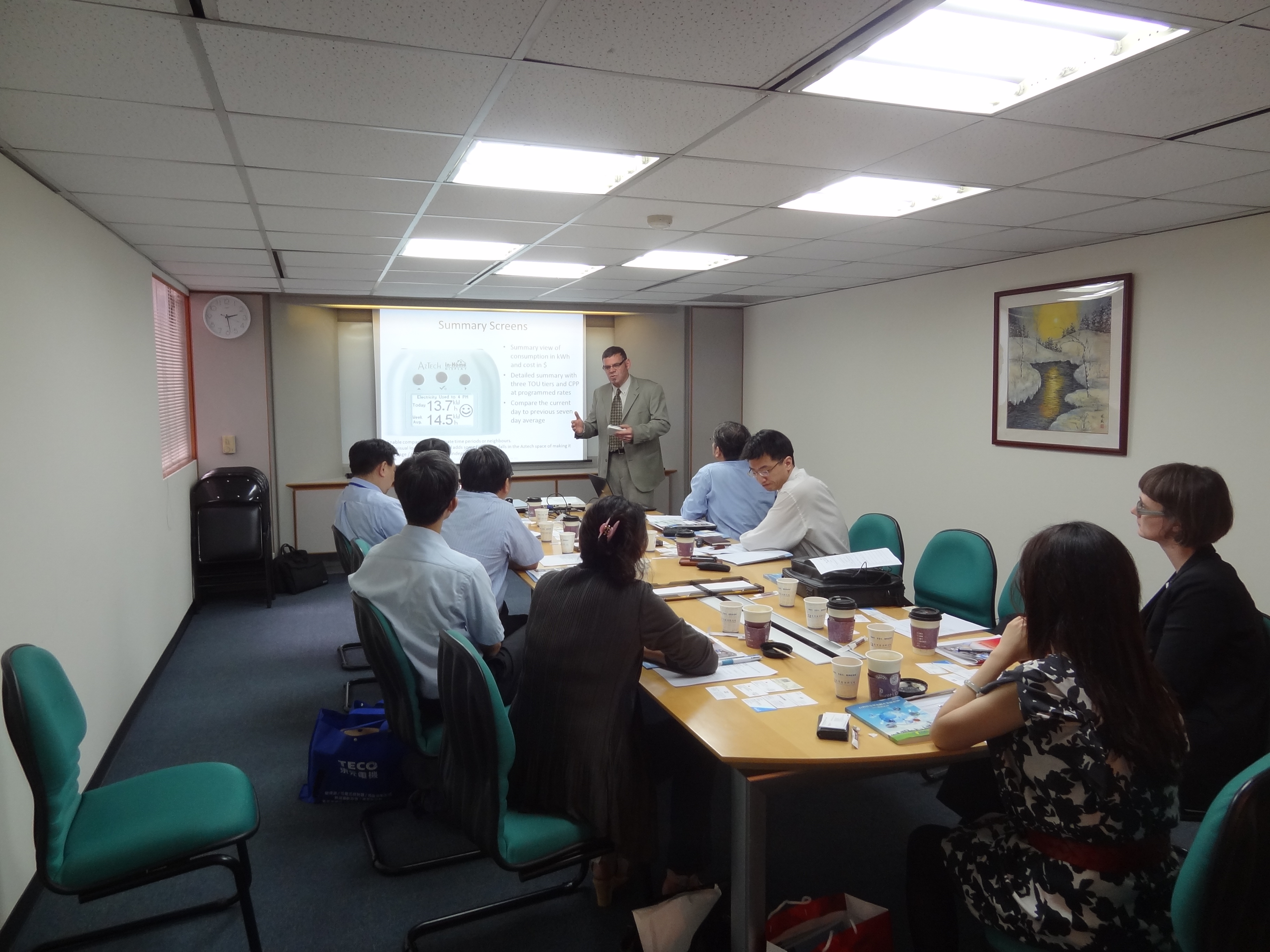 台灣智慧型電網產業協會於101年6月5日(二)下午2-4點假台泥大樓第二會議室召開「加拿大能源管理公司Aztech交流座談會」,會中由Aztech公司執行長Geoff Salter P.Eng.介紹該公司IHD家居顯示系統,能有效的將各種能源使用資訊透過無線網路顯示於屏幕上,並結合electric prepaid、能源效率計算等等,將對於日後推動智慧家庭有重大幫助。此外,陳副秘書長彥豪也於會議中向Aztech介紹台灣智慧型電網產業協會之概況及目標。與會之台灣廠商亦進行簡報,各公司介紹其相關產品及技術,並與Aztech針對台灣目前電力產業進行討論,加深合作共識。