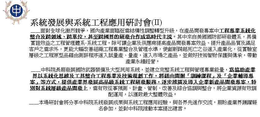 由中山科學研究院指導、中華民國產業科技發展協進會主辦之「中科院系統工程與發展研討會(II)」將於8月30日舉行。