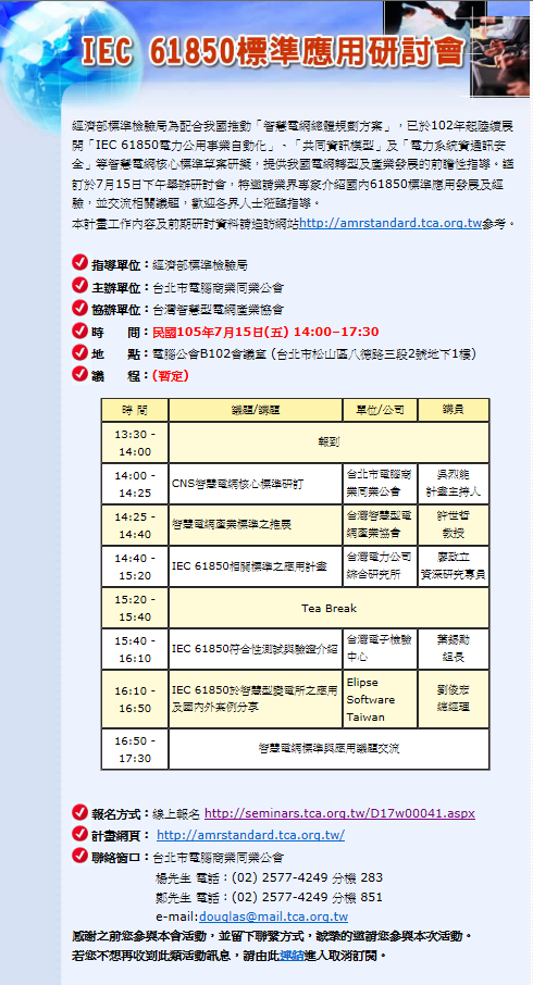 謹訂於7月15日下午舉辦研討會,特邀請業界專家介紹國內61850標準應用發展及經驗,並交流相關議題,歡迎各界人士蒞臨指導。